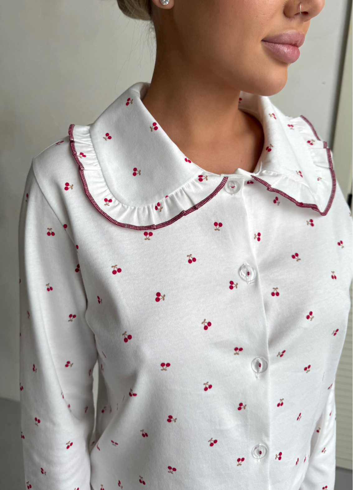 - Kleines kontrastreiches Kirschmuster sorgt für eine leichte und romantische Ausstrahlung.