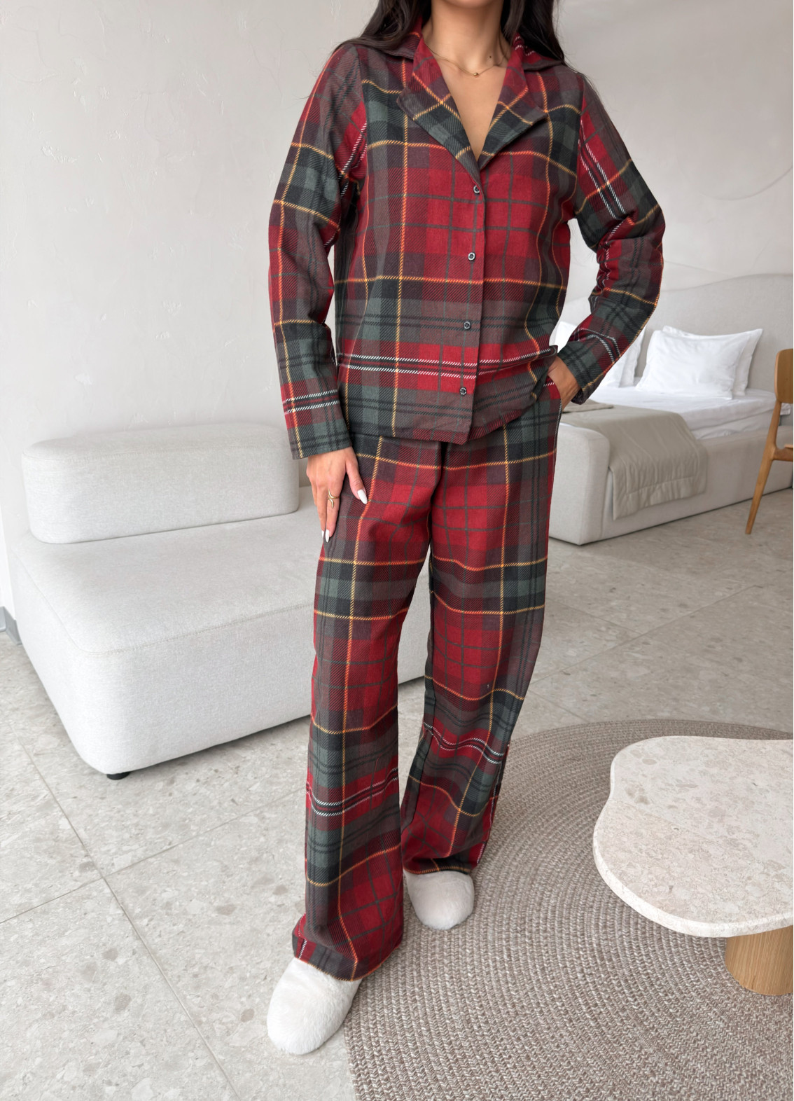 Die Hose hat einen geraden, bequemen Schnitt und eine gleichmäßige Passform an der Taille. Dank der durchdachten Konstruktion sitzt sie angenehm und bietet maximalen Komfort während des Schlafs und der Entspannung zu Hause. Der markante Karomuster-Stoff verleiht dem Set Eleganz und eine gemütliche Atmosphäre.