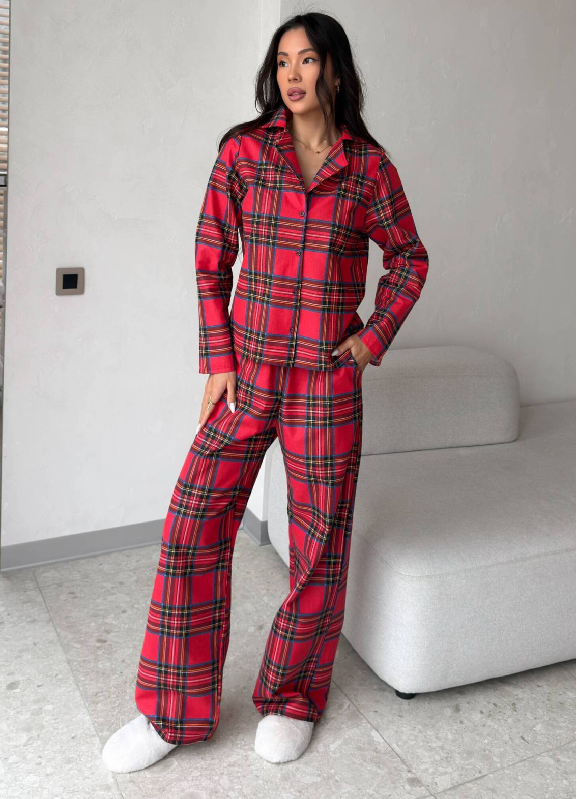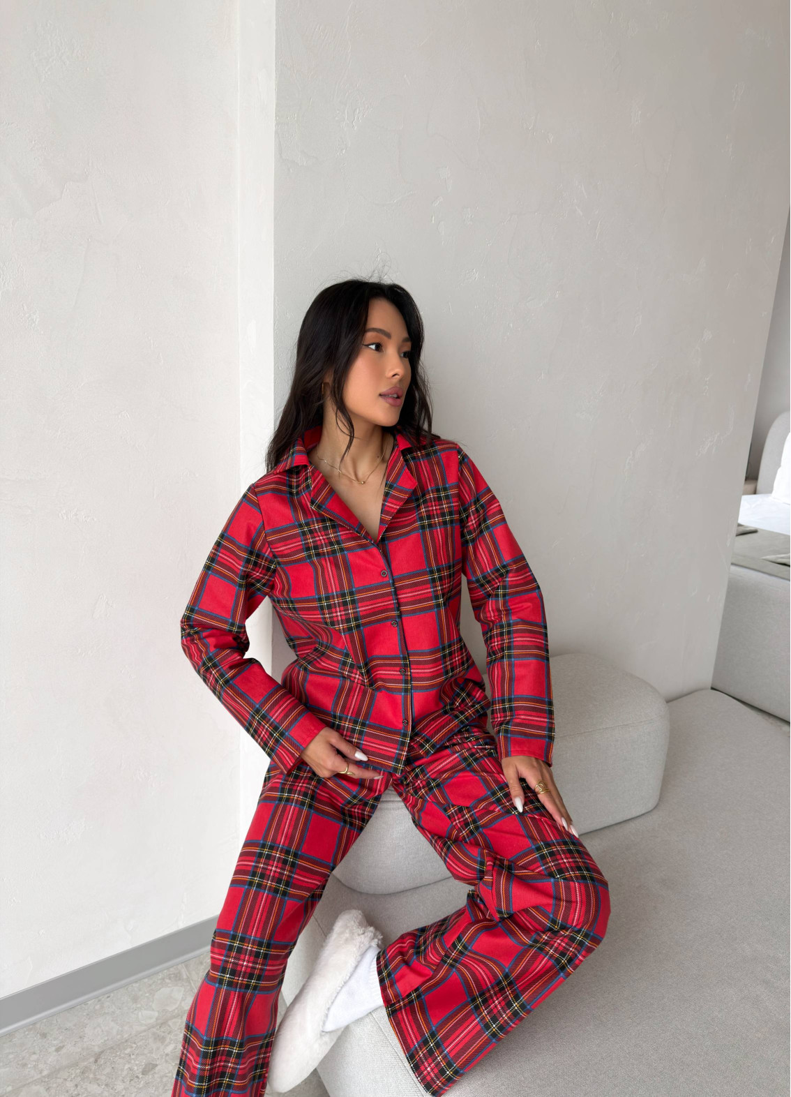 Der Pyjama "Phoebe" ist ein durchdachtes Set für entspanntes Wohlfühlen zu Hause und verbindet klassisches Karomuster mit einem bequemen Schnitt. Das Oberteil ist ein langärmliges Hemd mit Kragen, die Hose ist gerade geschnitten und besitzt einen elastischen Bund. Das Modell wirkt gleichzeitig gemütlich und gepflegt — ideal zum Schlafen und Entspannen zu Hause.
