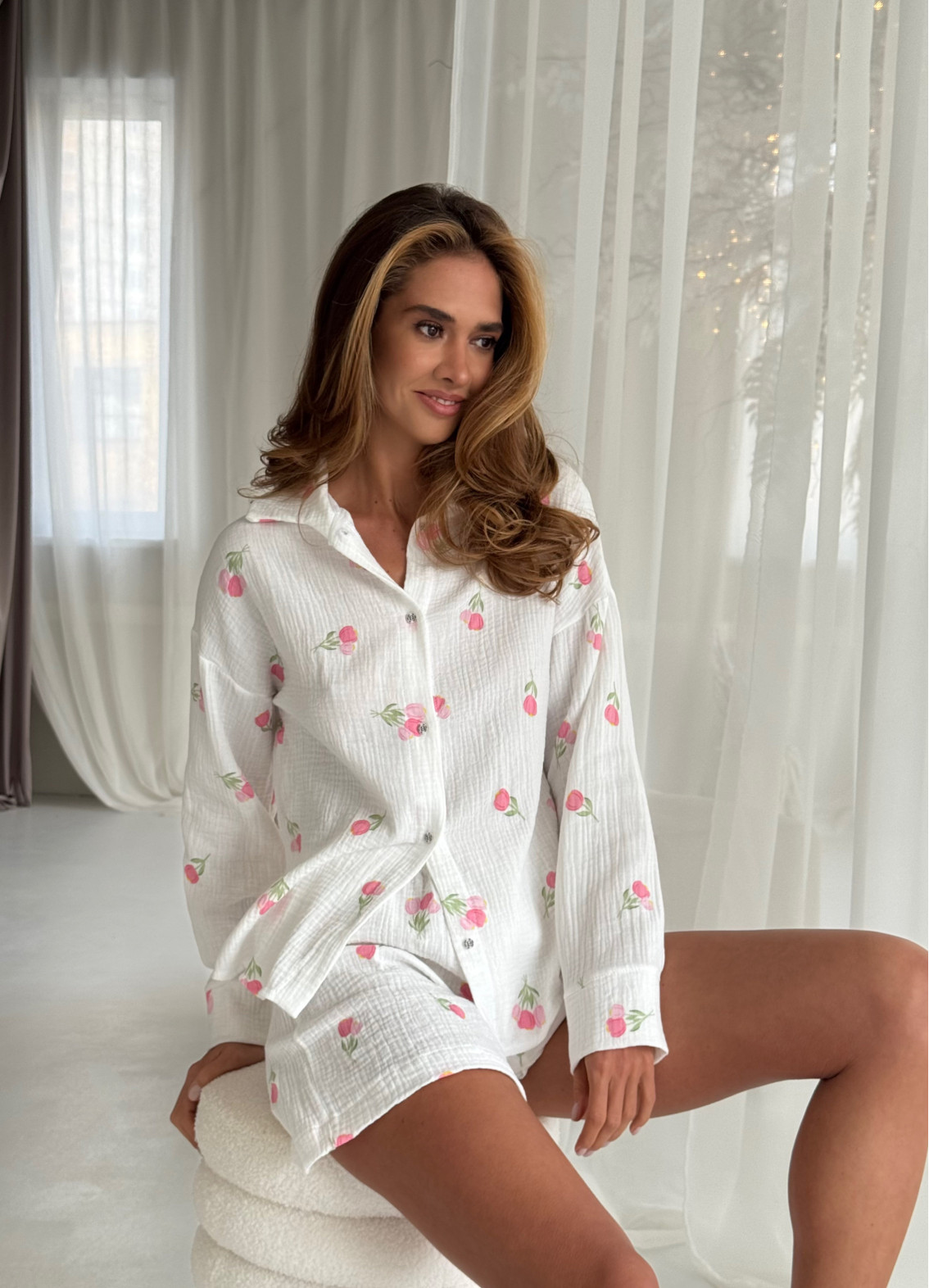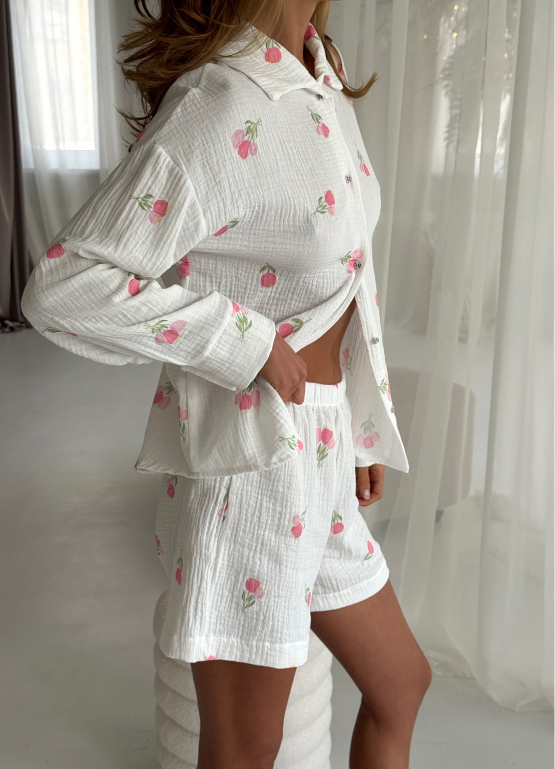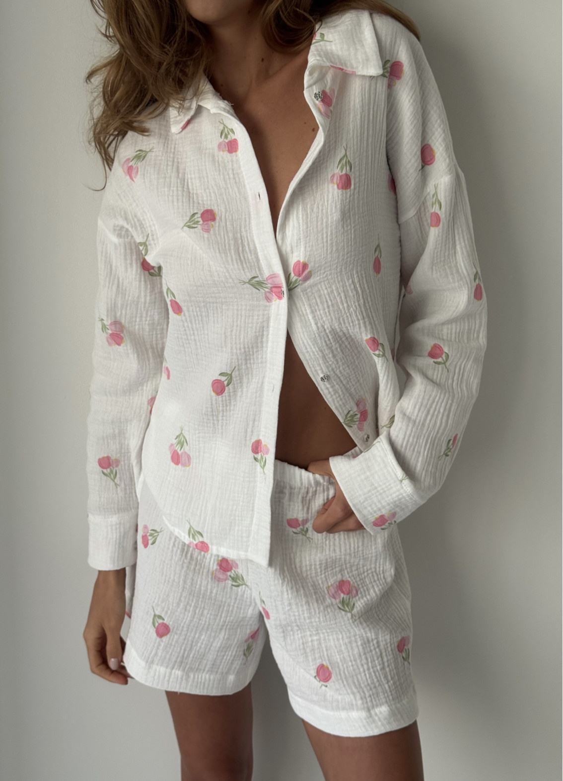 Piżama „Elaine” to delikatny i wygodny komplet do relaksu w domu i snu. Składa się z koszulki z kołnierzykiem i szortów, wykonanych w 100% z bawełny (musselin), która jest bardzo miękka, lekka i przyjemna w dotyku.