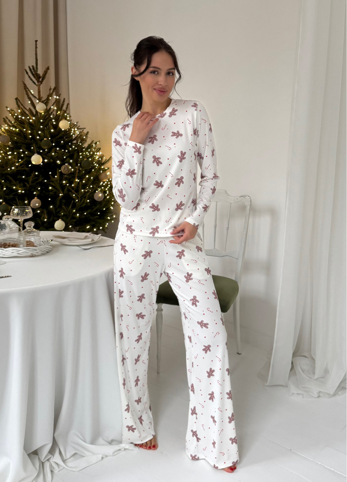 The “Ginger” pajamas are an exceptionally soft and cozy set designed for comfortable relaxation at home. The lightweight, stretchy fabric gently hugs the body, does not restrict movement, and provides pleasant tactile sensations. The festive gingerbread print adds a warm, holiday-inspired charm to the look.