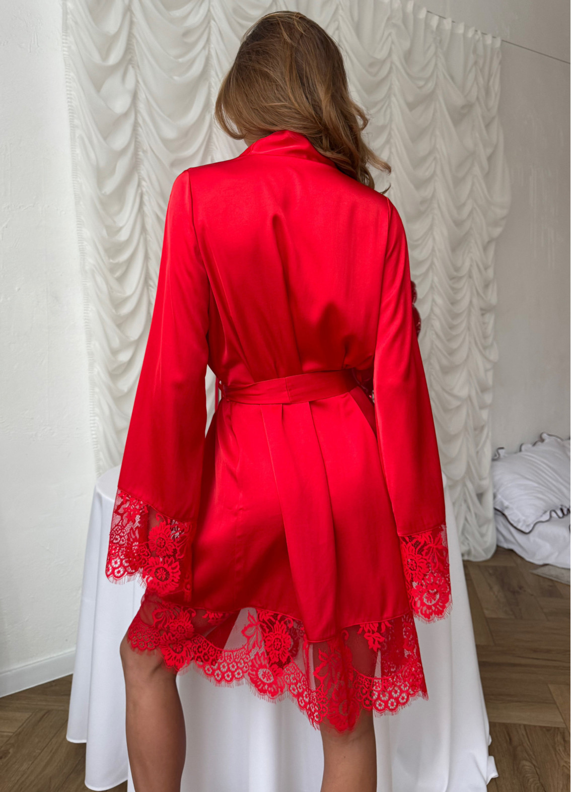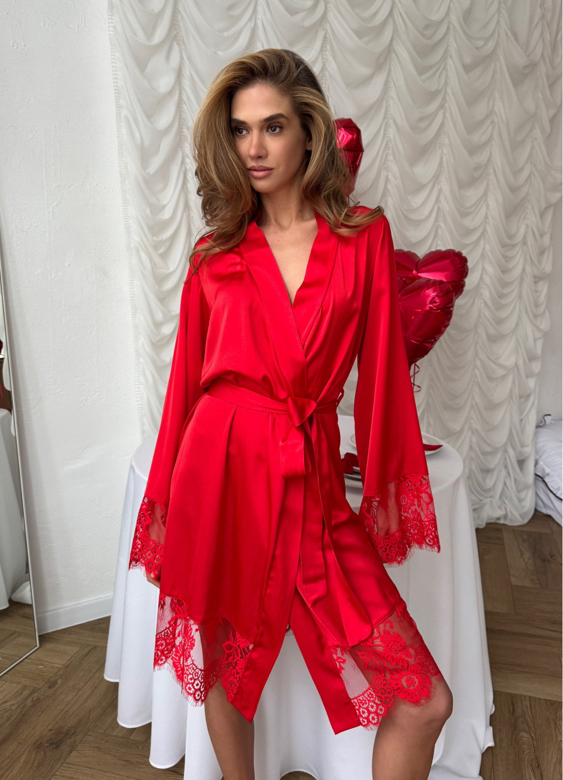 Parametry modelu: na modelce szlafrok w rozmiarze XS/S, wymiary 88–65–91, wzrost 175 cm.