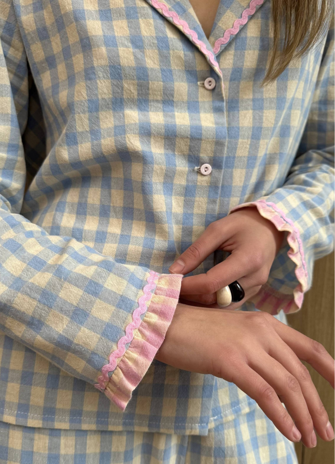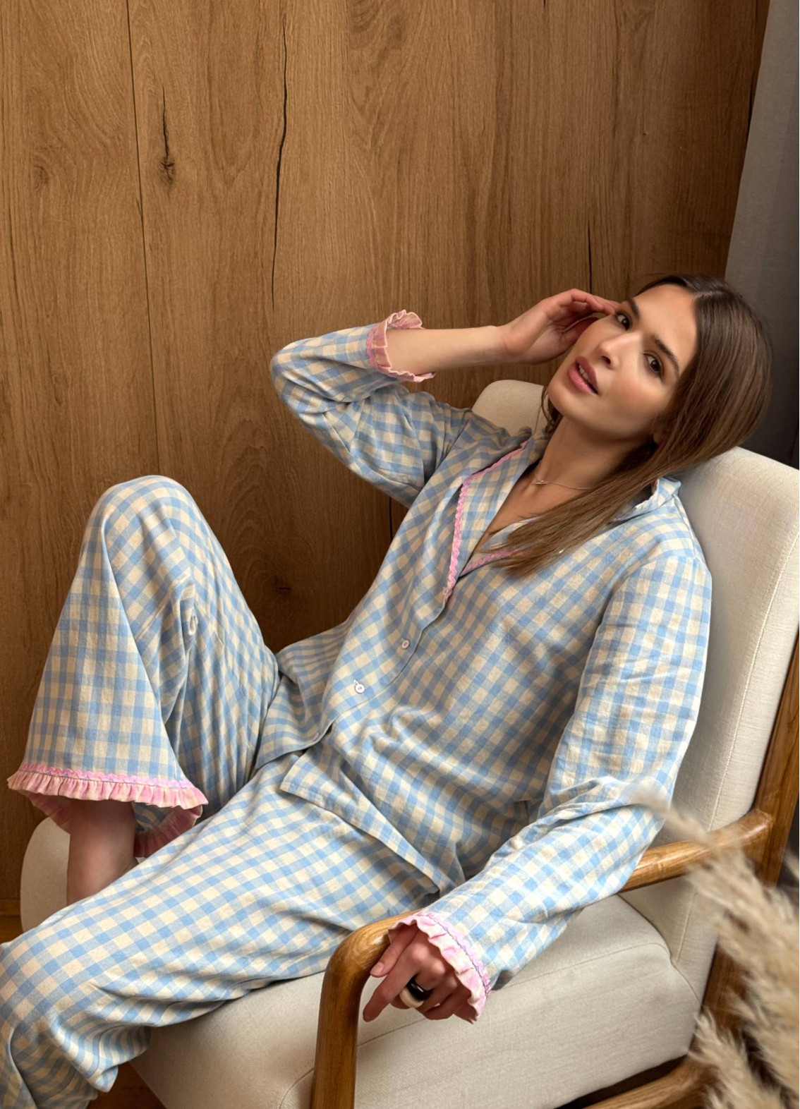 Damska bawełniana piżama "Freya" to elegancki i przytulny wybór na nocny odpoczynek. Wykonana z wysokiej jakości 100% bawełny, zapewnia maksymalny komfort o każdej porze roku. Góra w formie koszuli od piżamy w kratkę z krótkim rękawem dodaje uroku i stylu. Dół w formie szortów gwarantuje swobodę ruchów oraz dodatkową wygodę podczas snu. Dzięki wysokiej jakości materiałom i stylowemu designowi piżamy "Freya" będziesz czuć się komfortowo i przytulnie każdej nocy.