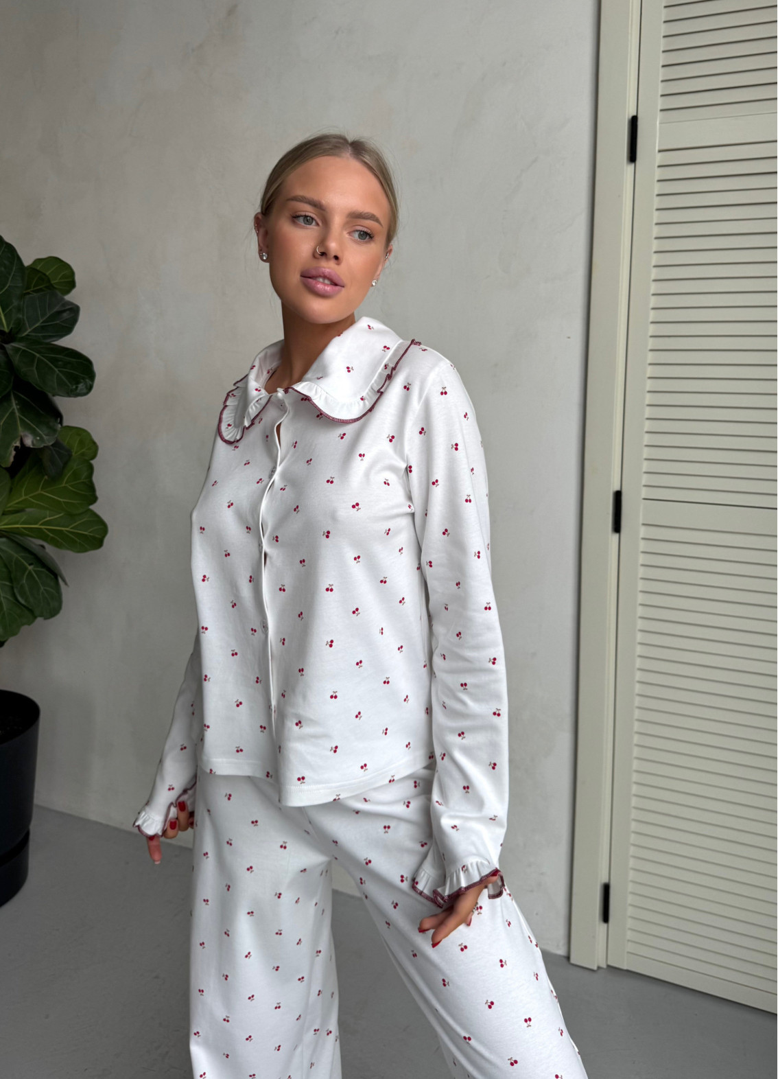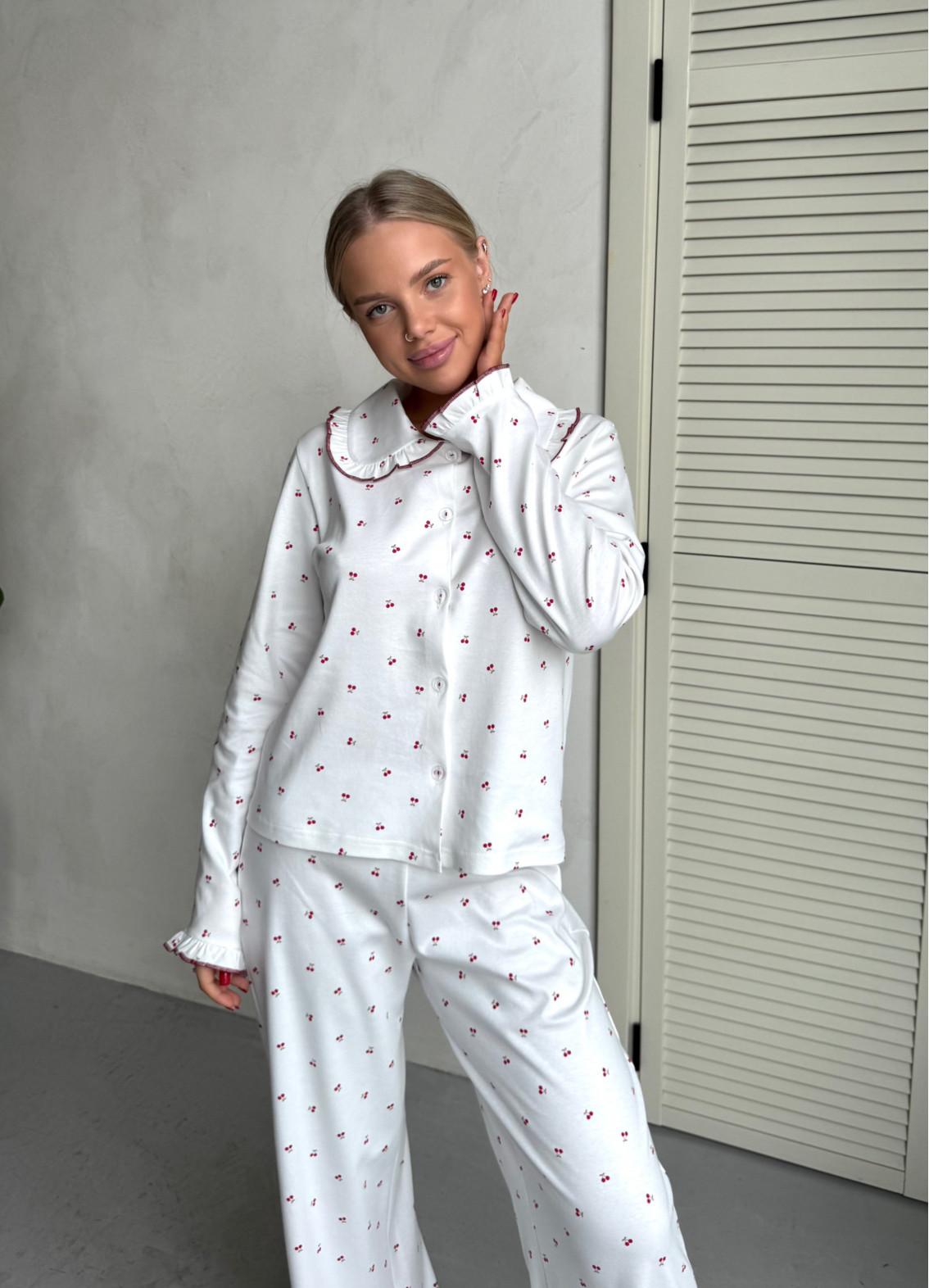 - Drobny kontrastowy print w wisienki tworzy lekki i romantyczny nastrój.