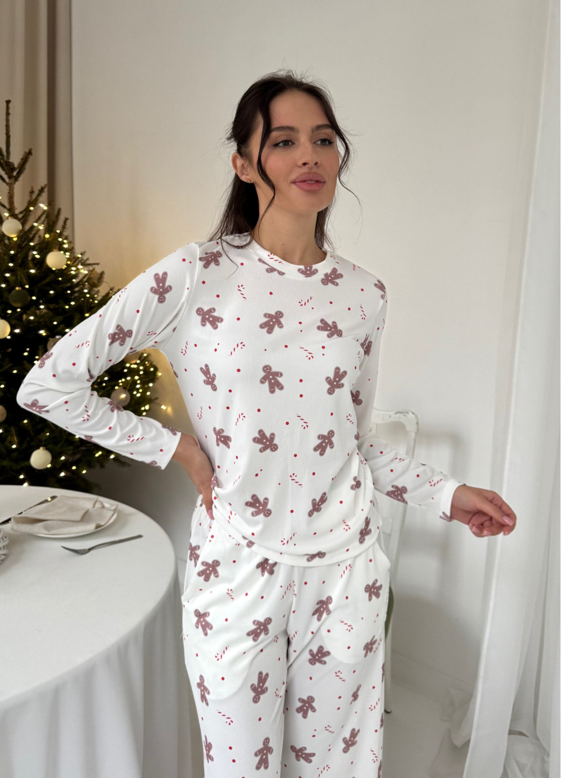 Piżama „Ginger” to niezwykle miękki i przytulny komplet stworzony z myślą o komfortowym wypoczynku w domu. Lekka, elastyczna tkanina delikatnie otula ciało, nie krępuje ruchów i zapewnia przyjemne doznania w dotyku. Świąteczny nadruk z motywem pierniczków dodaje stylizacji wyjątkowego, ciepłego charakteru.