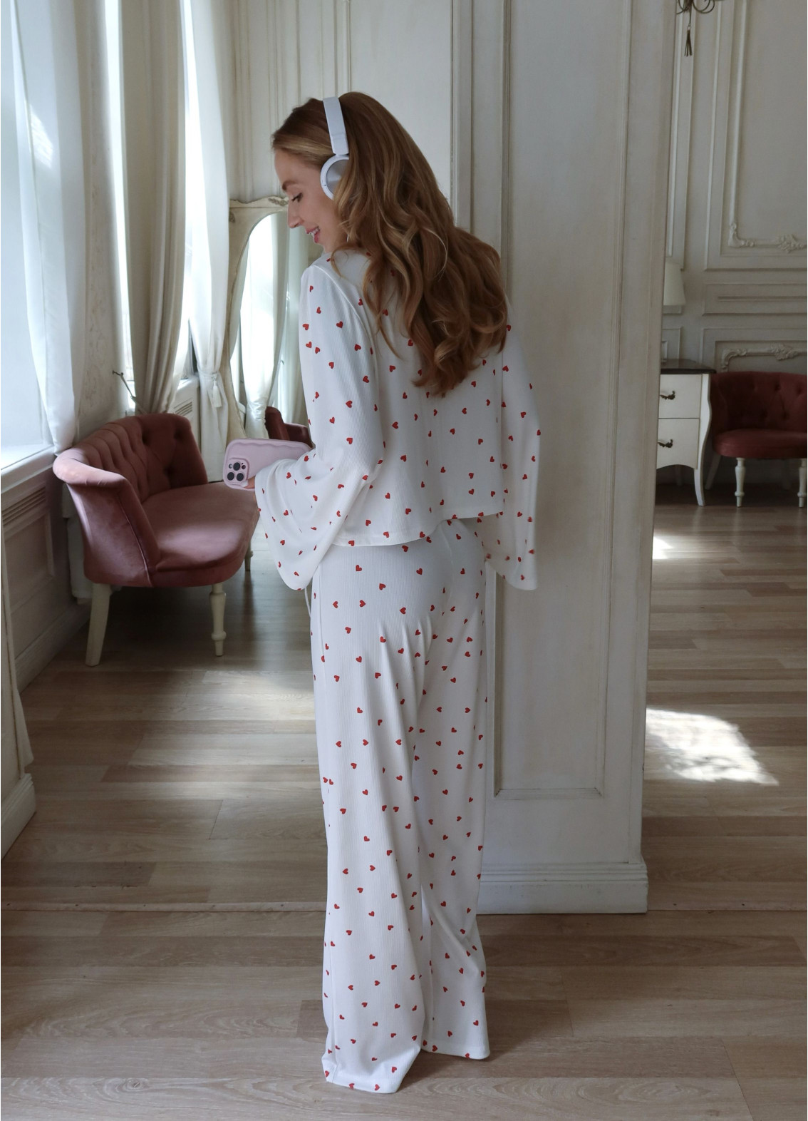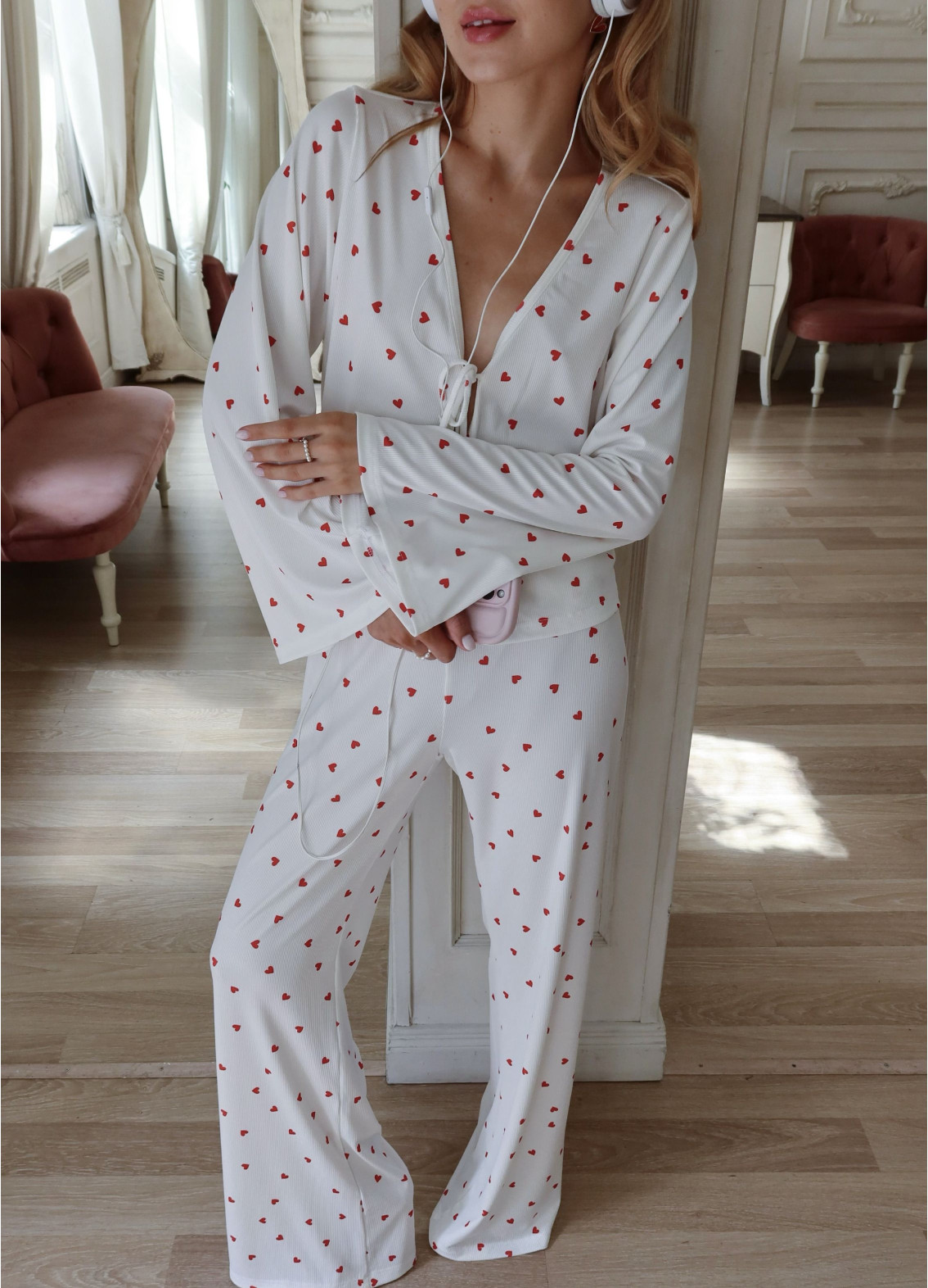 Piżama "Love" została stworzona dla osób, które cenią komfort i delikatność w odzieży domowej. Lekka i wygodna, idealnie nadaje się do odpoczynku i snu, zapewniając uczucie przytulności. Design podkreśla kobiecość i tworzy romantyczny nastrój.